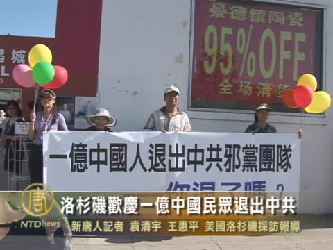 【新唐人2011年8月8日訊】2004年底「大紀元時報」推出系列社論「九評共產黨」後,自此,「三退」大潮席捲中華,至2011 月8月7日三退人數已然突破一億,洛杉磯退黨中心及民眾7日下午齊聚歡慶,祝賀一億中國民眾退出中共邪黨團隊。