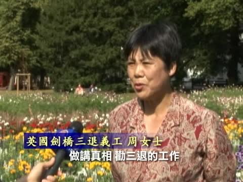 英國劍橋三退義工周女士:「好多一家子一家子到這兒來旅遊的,他們主動到我們攤位這兒來索取材料。儅他們看到我們的展板,他們都主動的把自己的姓告訴我,全家都在這兒退了。當時他們都是很高興的退了,沒有害怕和緊張的。」