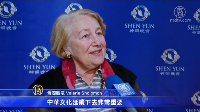 俄裔觀眾Valerie Sholomon:「中華文化延續下去非常重要,我原本來自共產國家,我知道有些事你是不能做的,你不能有你的信仰,你不能進行這種演出。神韻很美,你們要繼續,已經有很多成功了。」