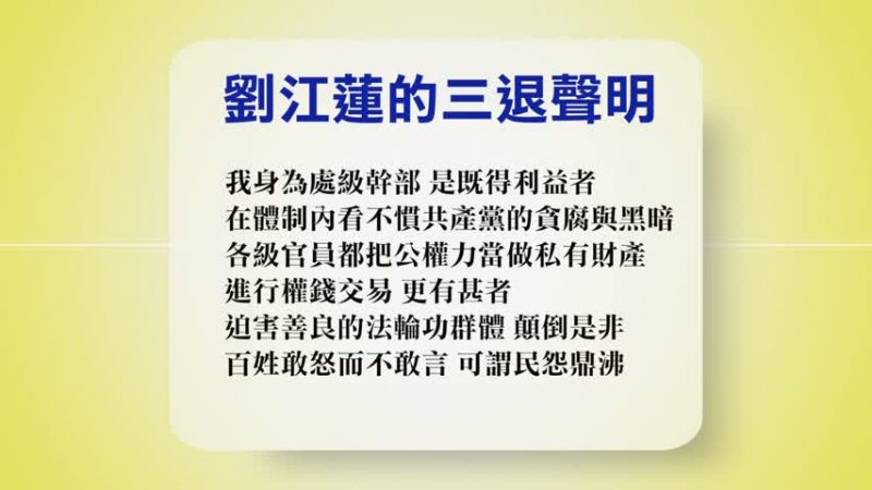 黑龍江佳木斯的劉江蓮說:我身為處級幹部,是既得利益者。在體制內看不慣共產黨的貪腐與黑暗。各級官員都把公權力當做私有財產進行權錢交易。更有甚者,迫害善良的法輪功群體,顛倒是非,百姓敢怒而不敢言,可謂民怨鼎沸。這樣的惡黨,如此禍亂國家,早晚會有報應的。我退出中共惡黨,不與邪惡為伍,也是良心的安慰。