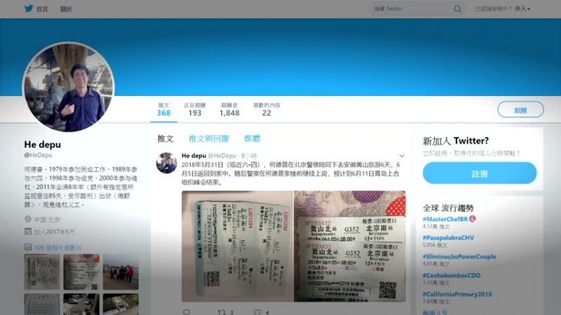 北京維權人士何德普:「旅遊了,去黃山了,31號去的,5號回來的,回來以後,警察又看著,可能給看到11號吧,青島不是有一個上合組織國家領導人聚集在那,搞了一個峰會嘛。遠是遠,但是它那也是一個大活動嘛,一個政治活動,所以全國異議人士也得看著,就是這麼回事。」