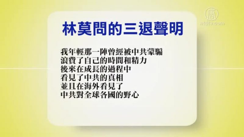 美國的林莫問說:我年輕那一陣曾經被中共蒙騙, 浪費了自己的時間和精力, 後來在成長的過程中看見了中共的真相, 並且在海外看見了中共對全球各國的野心,和對於西方國家的年輕選民的極其恐怖的迷惑,在此決定退出中共黨團隊,並且徹底拋棄其意識形態以及一切共產邪說的變種。本人已經受浸成為基督徒,自今天起, 中共的所做一切跟本人無關。本人和中共完全脫離一切附屬關係。
