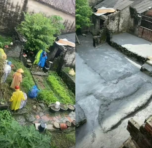 8月16日,一位佛山網友發照片,展示政府人員上門防疫,自己家院子被消殺後的情況:「原本的菜地全部被水泥封住。」