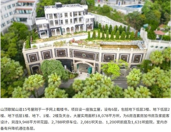 這座物業位於香港傳統豪宅區,地理位置優越。房屋實用面積為1.8萬平方英尺(約合1672平方米),包含3層獨立屋及3層地庫,採用六房六套間隔設計,配套花園近一萬平方英尺,停車位2788平方英尺。