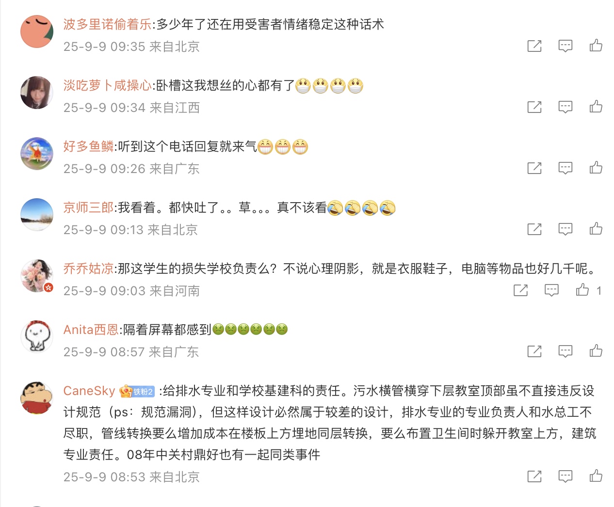 對此,有網友呼籲獨立第三方介入排查,檢修全校管網,公示整改計劃,以防止將來出來類似事件。同時,為受害學生提供免費健康檢查、心理干預及財產賠償。