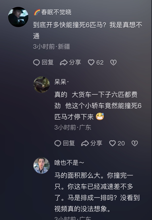 該事件引發了網友熱議。網友紛紛對一輛汽車能撞死6匹馬表示不可思議:「六匹,你飛起來了?」「不是哥們,你咋撞的?六匹啊,你是追著撞的麼」「到底開多快能撞死6匹馬?我是真想不通」「真的 ,大貨車一下子六匹都費勁 ,他這個小轎車竟然能撞死6匹馬才停下」「馬的面積那麼大。你撞完一隻。你這車已經減速差不多了。馬是排成一排嗎?」「沒看到視頻,真的沒法想像」「視野這麼開闊撞死6匹?」「馬那麼高你怎麼把它撞死的,還死了六匹?」