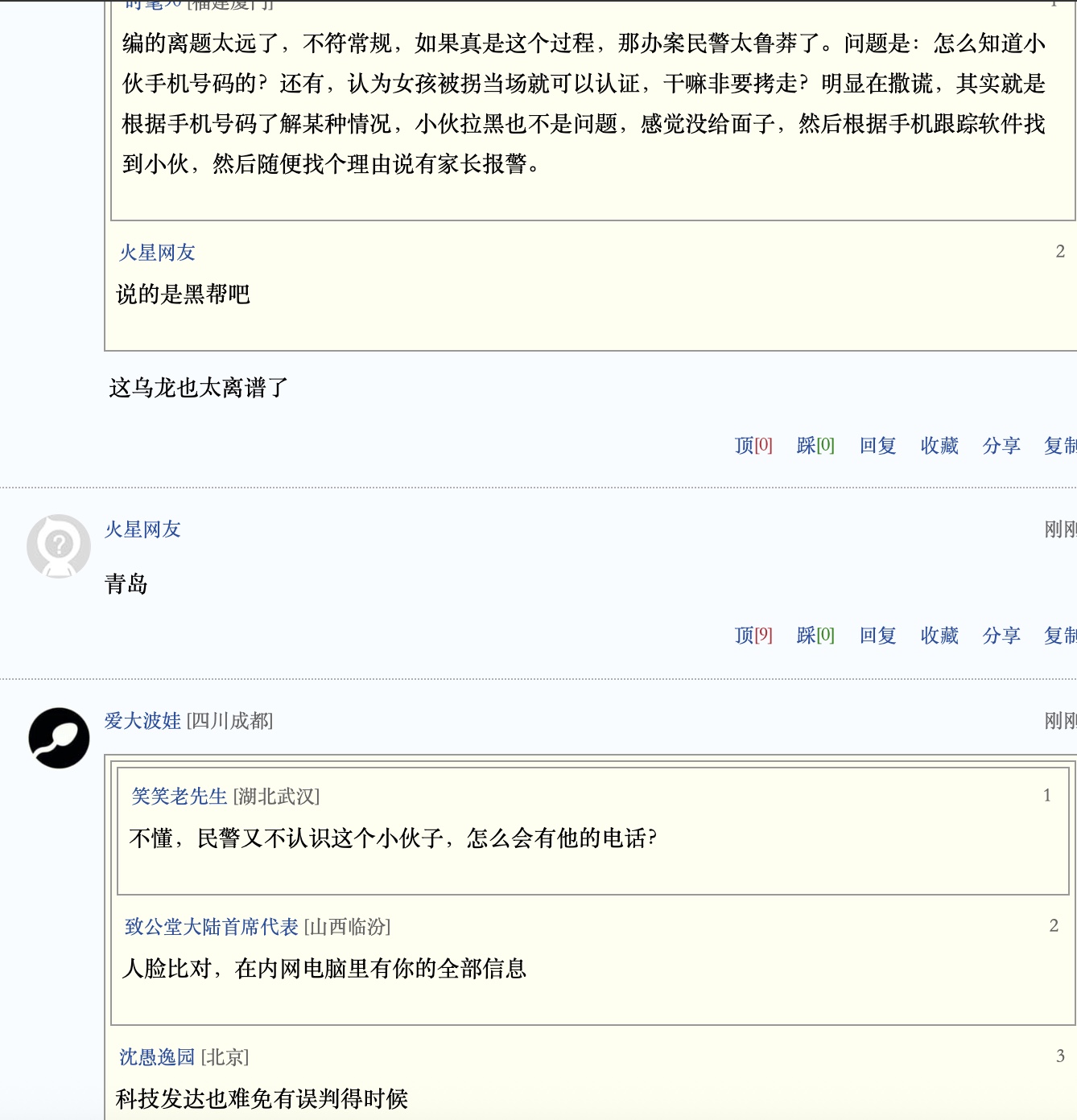 還有網友說,「編的離題太遠了,不符常規,如果真是這個過程,那辦案民警太魯莽了。問題是:怎麼知道小伙手機號碼的?還有,認為女孩被拐當場就可以認證,幹嘛非要拷走?明顯在撒謊,其實就是根據手機號碼了解某種情況,小伙拉黑也不是問題,感覺沒給面子,然後根據手機跟蹤軟件找到小伙,然後隨便找個理由說有家長報警」「你覺得抓錯了 。你就幼稚了」 。