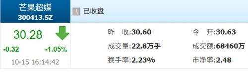 週三(10月15日),芒果超媒的股價以30.63元/股開盤,交易過程中震蕩頻繁,盤中一度跌破30元關口,報29.42元。截至下午4時14分,報收於30.28/股,跌幅1.05%。日內成交22.8萬手,成交額約為6.85億元,收盤時總市值為566億。