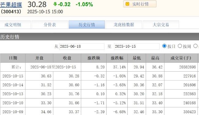 搜狐證券發佈的股價歷史行情顯示,「十一長假」結束後,從10月9日至15日期間,芒果超媒的股價從34.66/股,一路下跌到了目前的30.28/股,纍計下跌近13%。