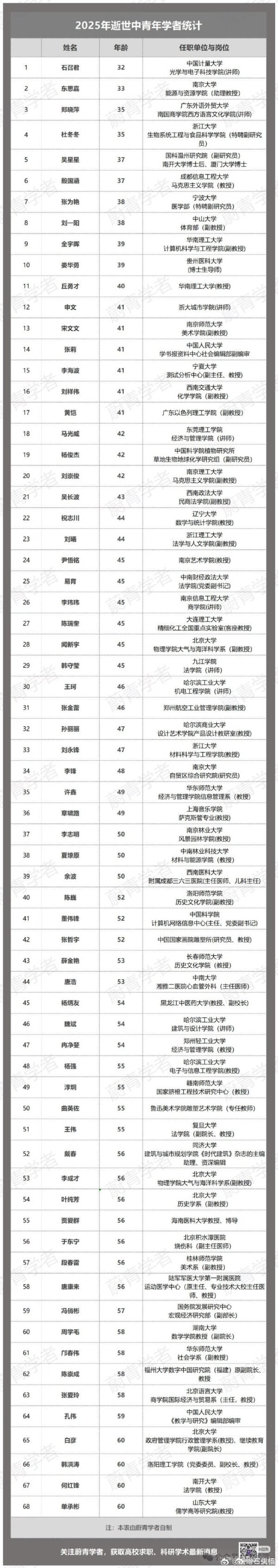 近年來,大陸高校年輕學者猝死頻發,自媒體「蔚青学者」早前對2025年猝死的中青年學者的統計,高達六十多位,50歲以下有三十多位。