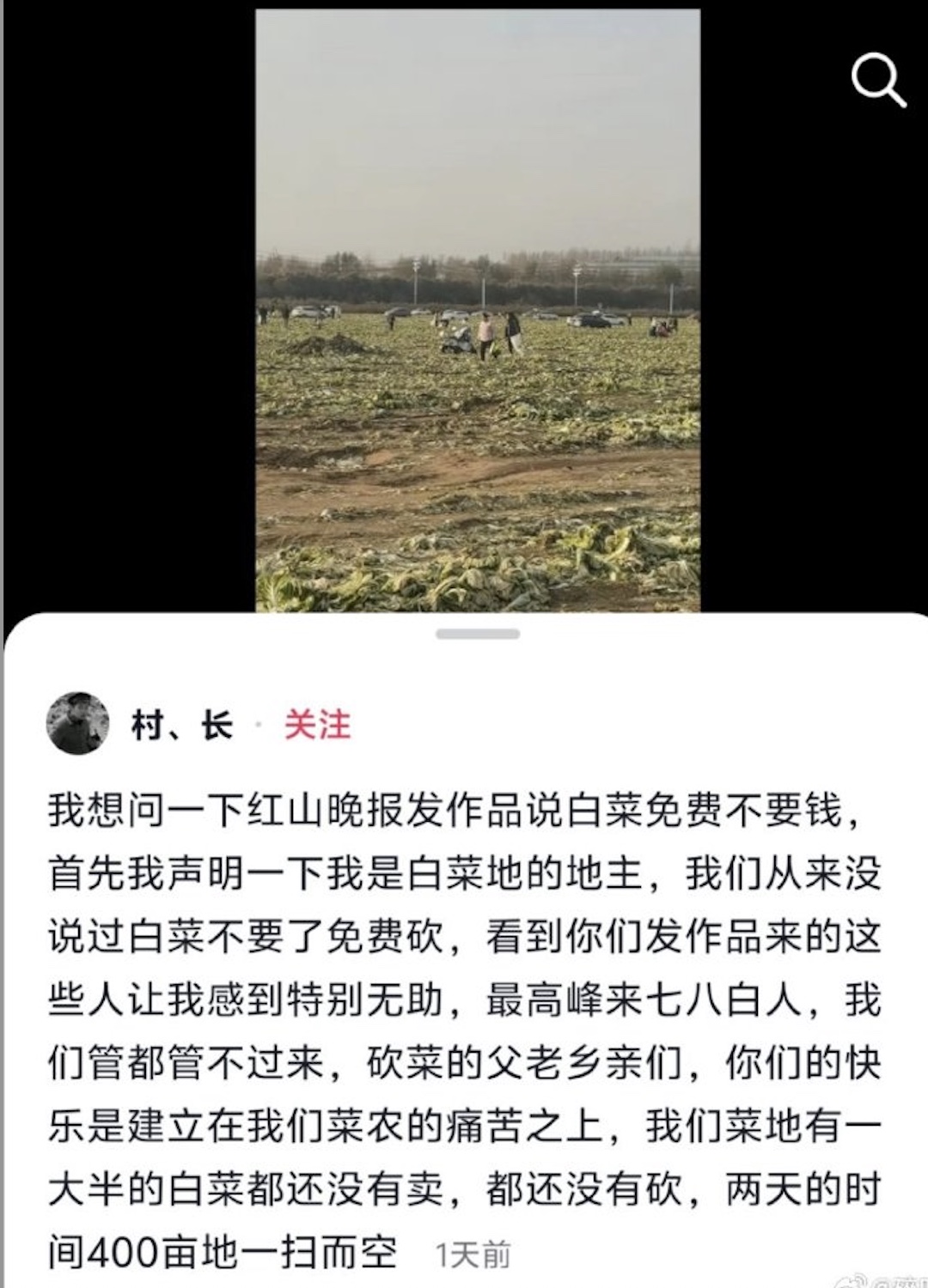 該農戶發帖說,「我想問一下紅山晚報發作品說白菜免費不要錢,首先我聲明一下我是白菜地的地主,我們從來沒說過白菜不要了免費砍,看到你們發作品來的這些人讓我感到特別無助,最高峰來七八百人,我們管都管不過來,砍菜的父老鄉親們,你們的快樂是建立在我們菜農的痛苦之上」。