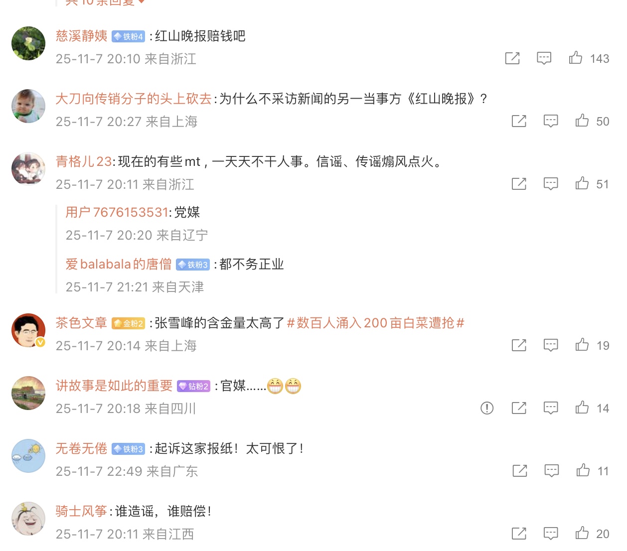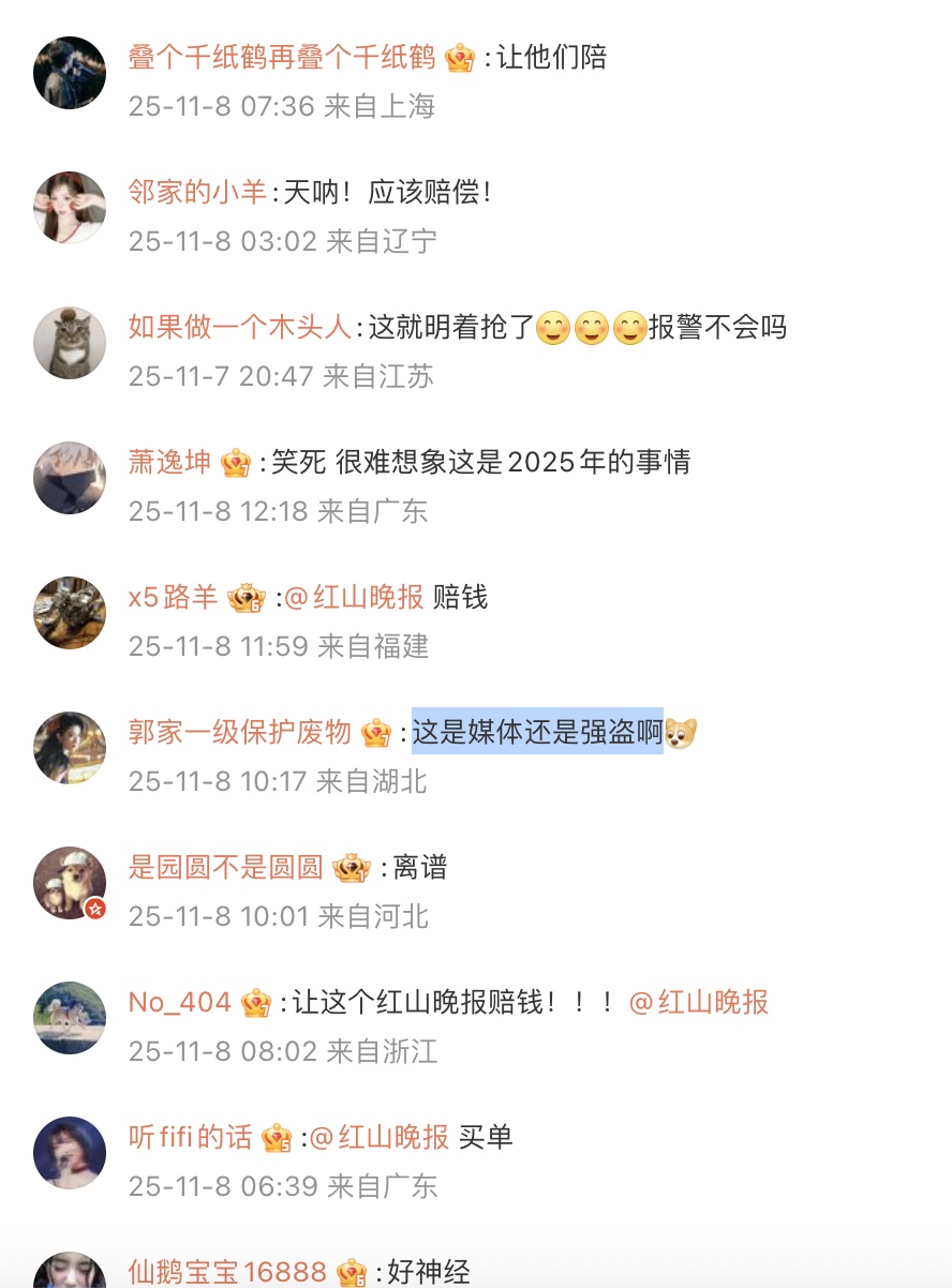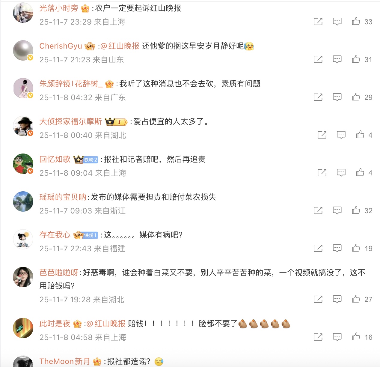 網友說,「讓紅山晚報賠!」「農戶一定要起訴紅山晚報」「報社和記者賠吧,然後再追責」「發布的媒體需要擔責和賠付菜農損失」「紅山買單唄,稿子是他們發的,出了事就別想跑」。