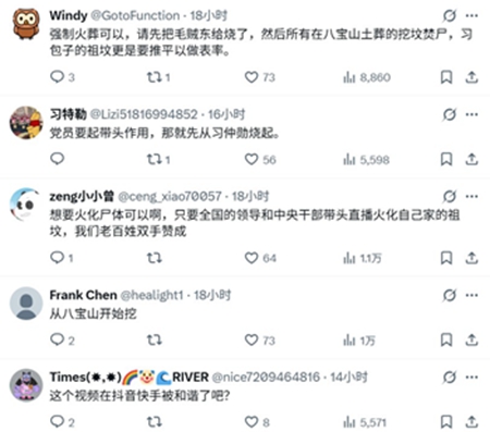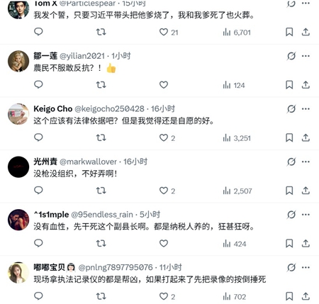 面對這次大規模抗議事件,還有網民說:「『先挖習近平祖墳』,是2025年聽到的最令人振奮的訴求。貴州人!」「貴州人很團結的,你當給你鬧著玩呢。」「我發個誓,只要習近平帶頭把他爹燒了,我和我爹死了也火葬。」