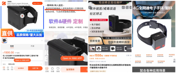 網友找到在阿里巴巴等購物網站上,可以隨處找到多種型號的電子跟蹤腳環(電子鐐銬)在售,看起來同于朦朧褲腿處露出的形狀頗為相似。