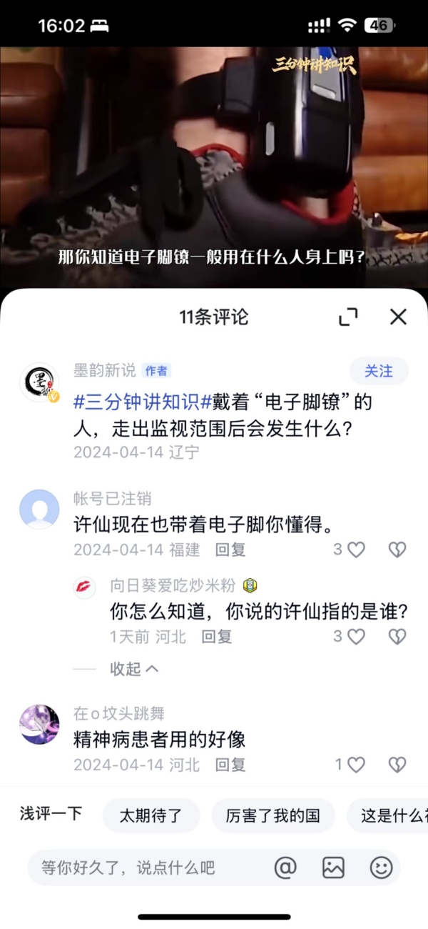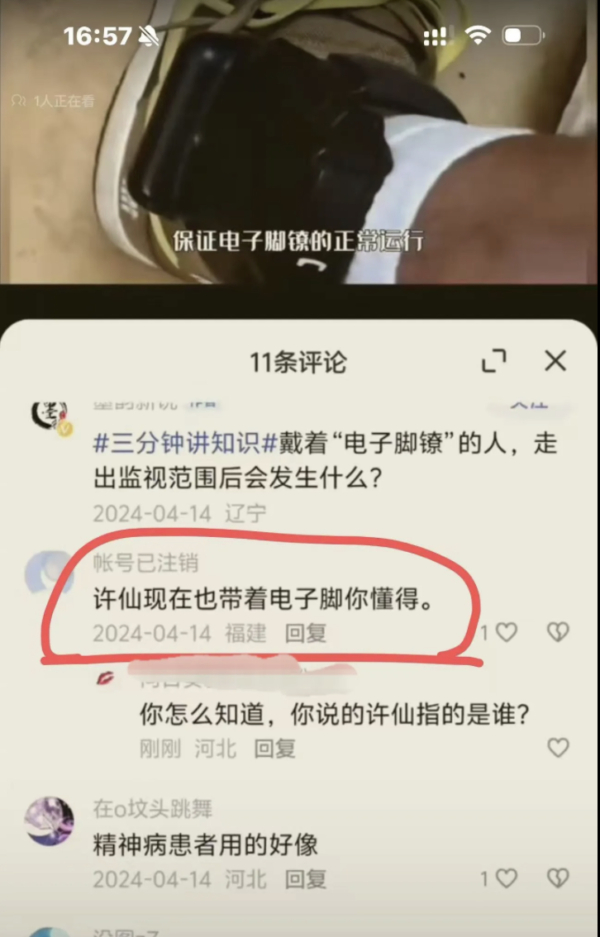 就在大家對此將信將疑時,12月7日,有大陸網友翻出,早在2024年4月14日,在一個有關「電子腳鐐」的話題下面,就有人披露「許仙(于朦朧飾演的角色)現在也帶著電子腳(鐐)」,並說「你懂得」。