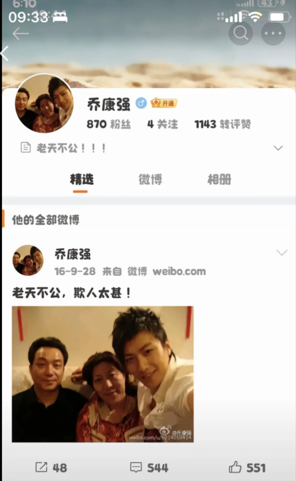喬任梁父親在喬任梁去世後,曾在微博留言:「老天不公,欺人太甚!」