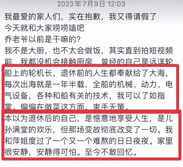 喬任梁父親在退休前是遠洋輪船上的輪機長,大半生都在海上,在拍攝短視頻之前幾乎沒有接觸過廚房。他本以為退休之後,可以享受人生,享受兒孫滿堂的歡樂,但那場變故(兒子的死)徹底改變了一切。「我和萍姐度過了一個又一個難熬的日日夜夜。家裡很安靜,安靜得可怕。至今不敢回憶。」