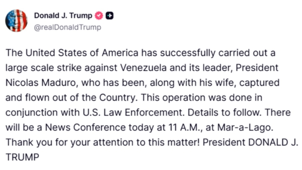 【1月3日 4:21】1月3日凌晨,川普在其「真相社交」媒體上發帖證實,美國已成功對委內瑞拉及其領導人馬杜羅總統發動大規模攻擊,馬杜羅及其妻子西莉亞·弗洛雷斯(Cilia Flores)已一起被抓獲,並被遣送出境。