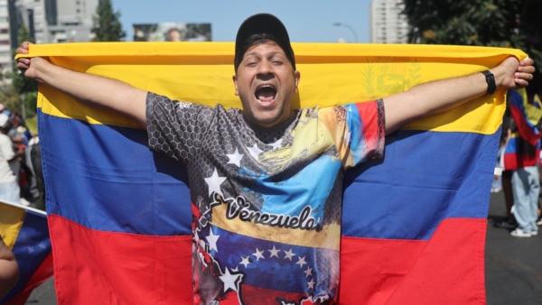 【1月3日 9:05】生活在智利的委內瑞拉人在聖地牙哥慶祝美國川普政府抓捕委內瑞拉領導人馬杜羅。