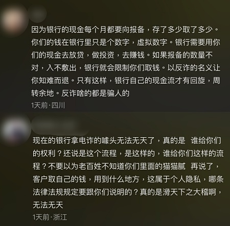 還有網友透露內情:「因為銀行的現金每個月都要報備,存了多少取了多少。你們的錢在銀行裡只是個數字,虛擬數字。銀行需要用你們的現金去放貸,做投資,去賺錢。如果報備的數量不對,入不敷出,銀行就會限制你們取錢。以反詐的名義讓你知難而退。只有這樣,銀行自己的現金流才有迴旋,周轉餘地。反詐啥的都是騙人的。」