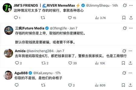 上述視頻在海外X平台上也引發熱議,不少網友評論說:「存錢的時候你是上帝,取錢的時候你是嫌疑犯。」