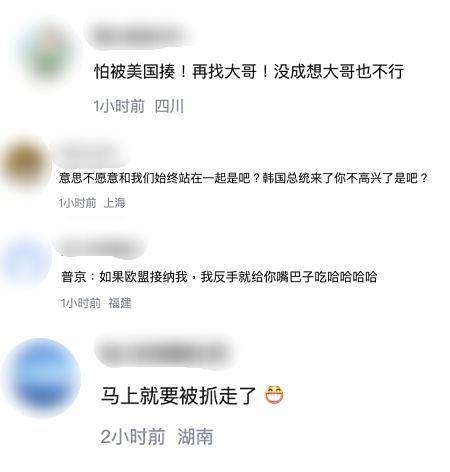 還有網友直言,朝俄只是互相利用的關係,「普京:如果歐盟接納我,我反手就給你嘴巴子吃哈哈哈哈。」