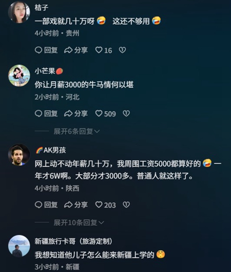 有網民在抖音平台說,「一部戲就幾十萬呀,這還不夠用。」「你讓月薪3000的牛馬情何以堪。」「閆學晶事件,說明了一個問題,現在大家日子都不好過,大家火氣都很大,這可是個危險的信號。」