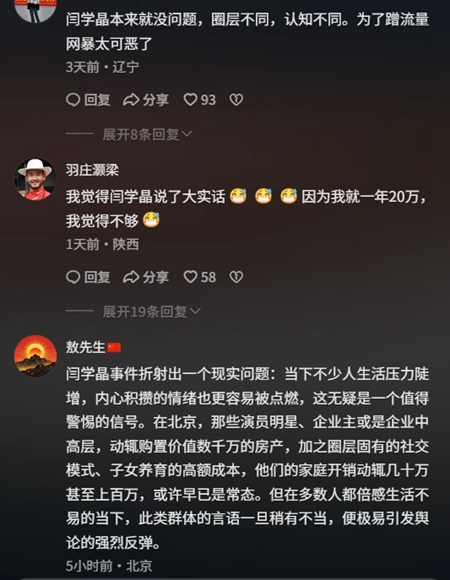 還有網民表示,閆學晶事件折射出一個現實問題:當下不少人生活壓力陡增,內心積攢的情緒也更容易被點燃,這無疑是一個值得警惕的信號。在北京,那些演員明星、企業主或是企業中高層,動輒購置價值數千萬的房產,加之圈層固有的社交模式、子女養育的高額成本,他們的家庭開銷動輒幾十萬甚至上百萬,或許早已是常態。但在多數人都倍感生活不易的當下,此類群體的言語一旦稍有不當,便極易引發輿論的強烈反彈。