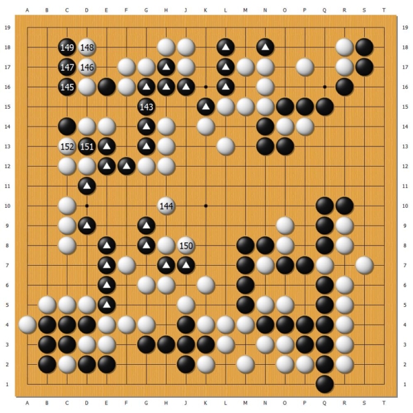 實戰,黑棋孤子逃向中腹,申旻埈得勢不饒人,白144、150兩手棋,繼續趕盡殺絕,但並未意識到左上角仍留有餘味的嚴重性。一力遼索性置大龍生死於不顧,反手掏掉白左上角,黑151衝斷白棋連絡,轉守為攻,形成對殺。