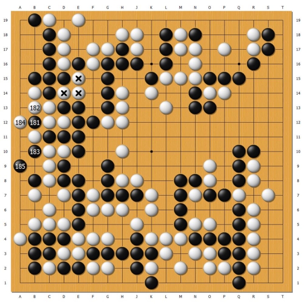 交戰中,黑185一路小尖妙手造劫,恰逢申旻埈時間用盡,剛進入讀秒,申旻埈無暇細算,出現失誤。白無法承負劫敗之痛,只得捨棄三子棋筋,黑中腹大龍與角部貫通,置之死地而後生。
