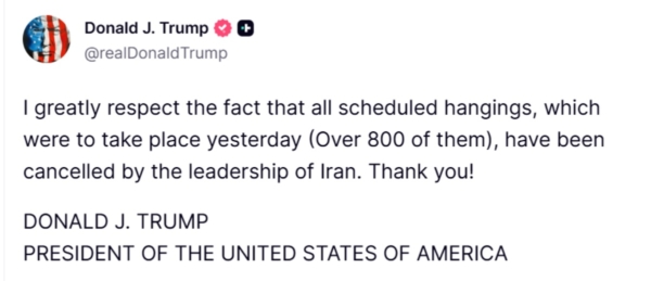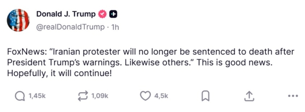 伊朗當局週四稱,抗議中被捕的26歲店主索爾塔尼(Erfan Soltani)不會面臨處決。川普週四清晨在 Truth Social 上發文表示,這是「好消息。希望這能持續下去!」