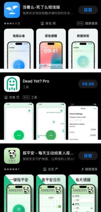 「死了麼」是一款專為獨居人群設計的確認生命安全的App。用戶可事先設定緊急聯絡人,然後通過定期上App「簽到」確認自己「還活著」。如果連續多日未簽到,軟件系統會自動向緊急聯絡人發送電子郵件,提示該獨居老人可能發生了意外。