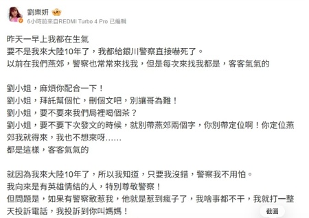 根據劉樂妍的貼文,她以前住在北京燕郊的時候,中共警察就經常上門找她,請她刪貼文,或者請她去警察局「喝個茶」。