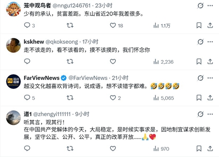 在海外X中文平台,有網友說,習近平將這個故事說給外國人聽,「出洋相了」,「越沒文化越喜歡背詩詞,說成語,想不讀錯字都難。」