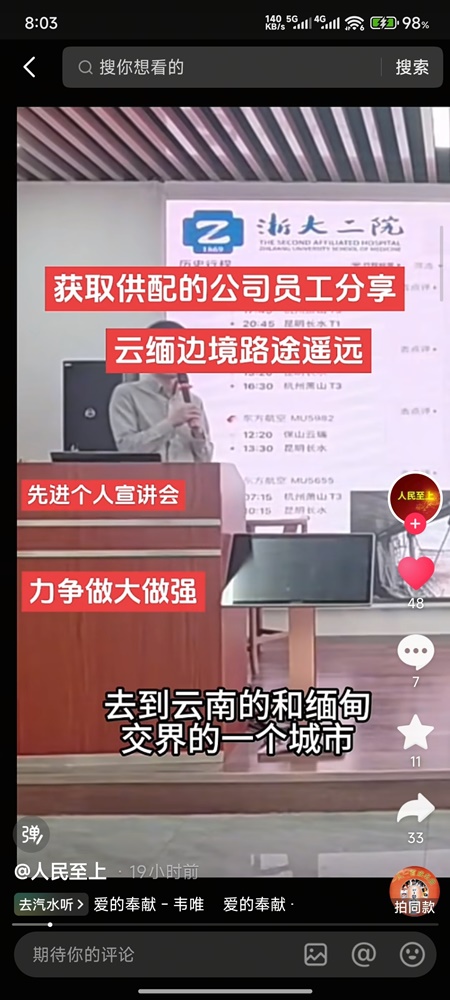 該院一名醫生在視頻中炫耀了自己去年「器官移植成績」。他說,「在今年也就是我負責獲取的第一例的供肺,去到雲南的和緬甸交界的一個城市,那麼也是在獲取到分配以後,其實已經深夜了。當時我已經出去了,所以我當時看了天氣的信息以後,我選擇最早的一個航班。」