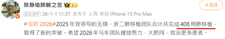 2026年1月1日,浙大二院副院長陳靜瑜在微博中自曝:「2025年我領導的無錫、浙二肺移植團隊合計共完成408例肺移植。」其中浙大二院完成了213例肺移植。