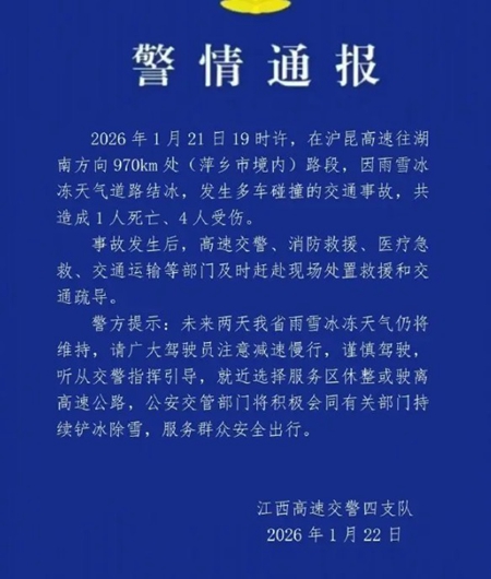 江西警方1月22日通報,2026年1月21日19時許,在滬昆高速往湖南方向970公里處(萍鄉市境內)路段,因雨雪冰凍天氣道路結冰,發生多車碰撞的交通事故,共造成1人死亡、4人受傷。