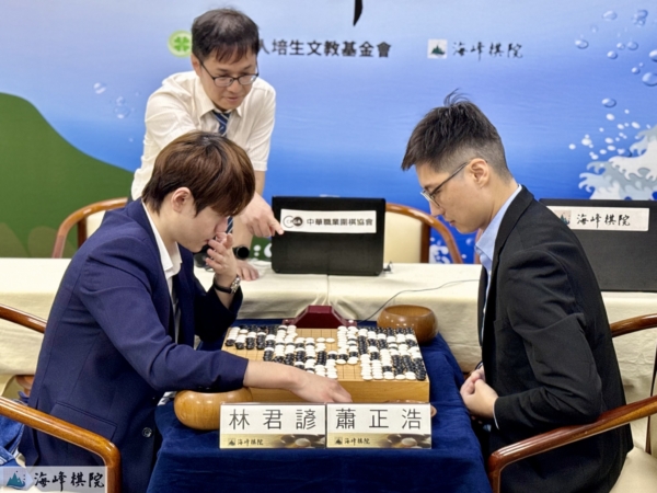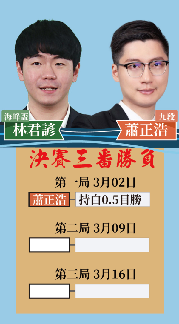 雙方鏖戰至最後一刻,局面數度陷入膠著,最終蕭正浩九段憑藉極其穩定的心態,以「半目」之差戰勝林君諺,搶下決賽首勝,目前1:0領先。
