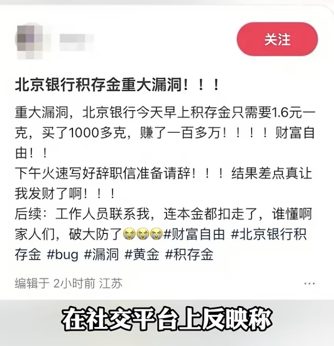 在大陸社交平台上,不少網友分享當天北京銀行積存金帳戶出現重大漏洞。有截圖顯示,一名客戶自稱在當天上午9點多,以1.60元(人民幣,下同)/克的實時買入價買入1110克黃金,之後又全部按照1173.4元/克的實時賣出價賣出,由此輕鬆實現了超過130萬元的交易利得。