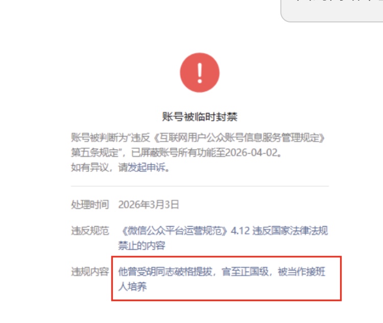 文章顯示,3月3日,一個公眾號因為說了「他曾受胡同志破格提拔,官至正國級,被當作接班人培養」的內容,被判違規,帳號被封禁。