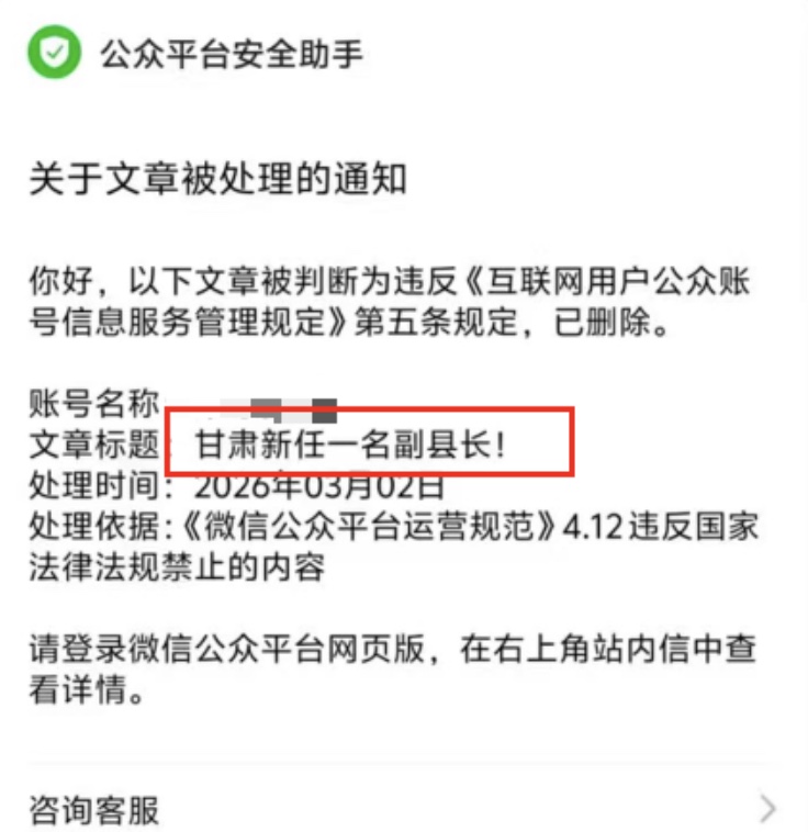 3月2日,一篇標題位《甘肅新任一名副縣長》,被判違規,文章被刪除。