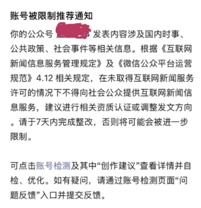 還有一公眾號因為發表內容「涉及國內時事、公共政策、社會事件等相關信息,被限制推薦。