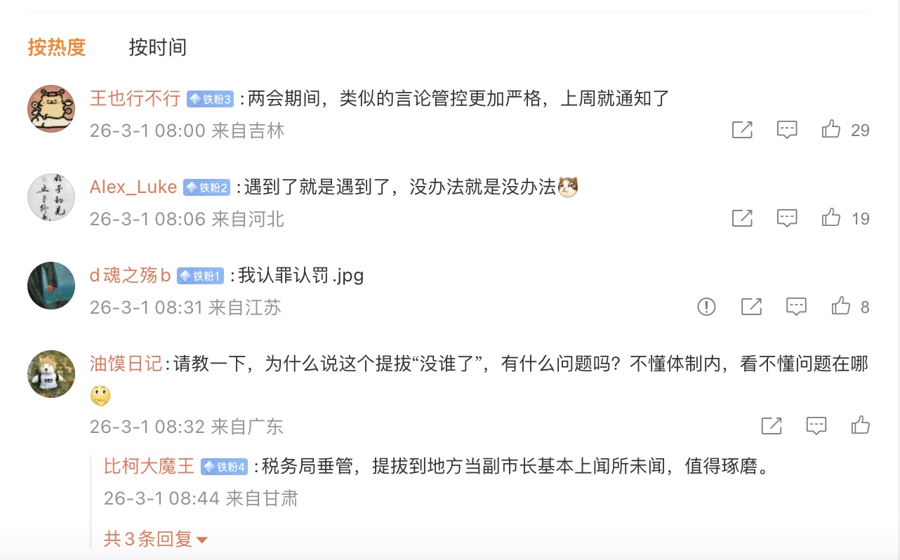 3月1日,有微博網友針對某市提拔了一名副市長,而被封號。有網友在評論區透露,「兩會期間,類似的言論管控更加嚴格,上週就通知了」。
