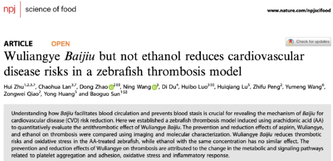近日引發輿論關注的那篇有關五糧液「抗血栓」的論文,題目是《五糧液白酒而非乙醇可降低斑馬魚血栓模型中的心血管疾病風險》(英文題目: Wuliangye Baijiu but not ethanol reduces cardiovascular disease risks in a zebrafish thrombosis model),由北京工商大學研究團隊主導進行實驗,於2022年12月在《自然》(Nature)旗下子刊《自然-食品科學》(npj-Science of Food)上發表。