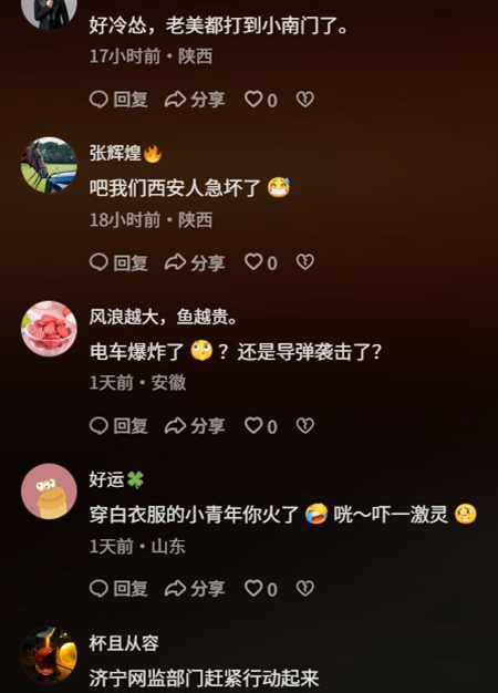 有當地網民稱,爆炸現場如同伊朗戰場,「不知道的以為是在中東」「咋了,還以為是伊朗呢」「我還以為美國打過來了呢」「是不是美國打過來的炸彈」「好冷慫,老美都打到小南門了」「是以色列打過來的嗎?」