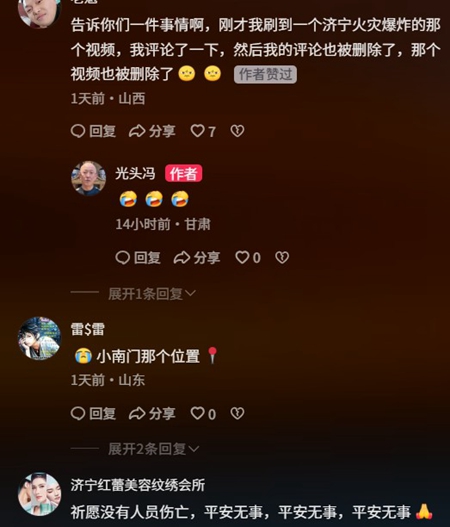 還有網民說:「剛才我刷到一個濟寧火災爆炸的那個視頻,我評論了一下,然後我的評論也被刪除了,那個視頻也被刪除了。」