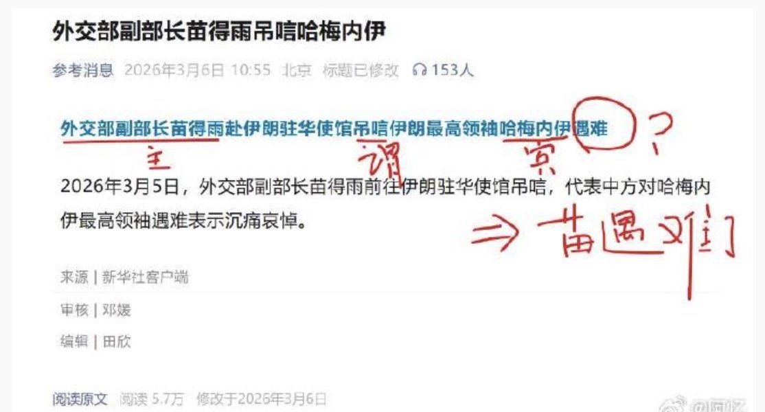 【新唐人北京時間2026年03月08日訊】最近,美國和以色列打擊伊朗,第一天就炸死了哈梅內伊及其幾十個高層。中共兔死狐悲,派出官員到伊朗駐華使館弔唁,但在發布消息時犯了低級語法錯誤,被網友嘲諷「 苗得雨遇難?」