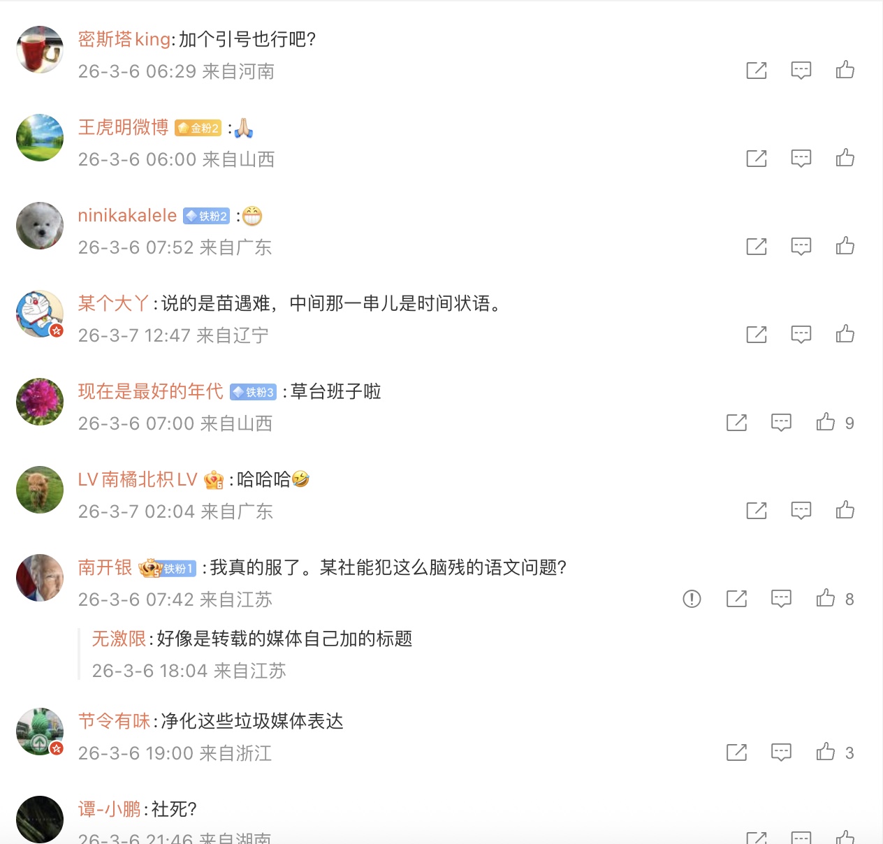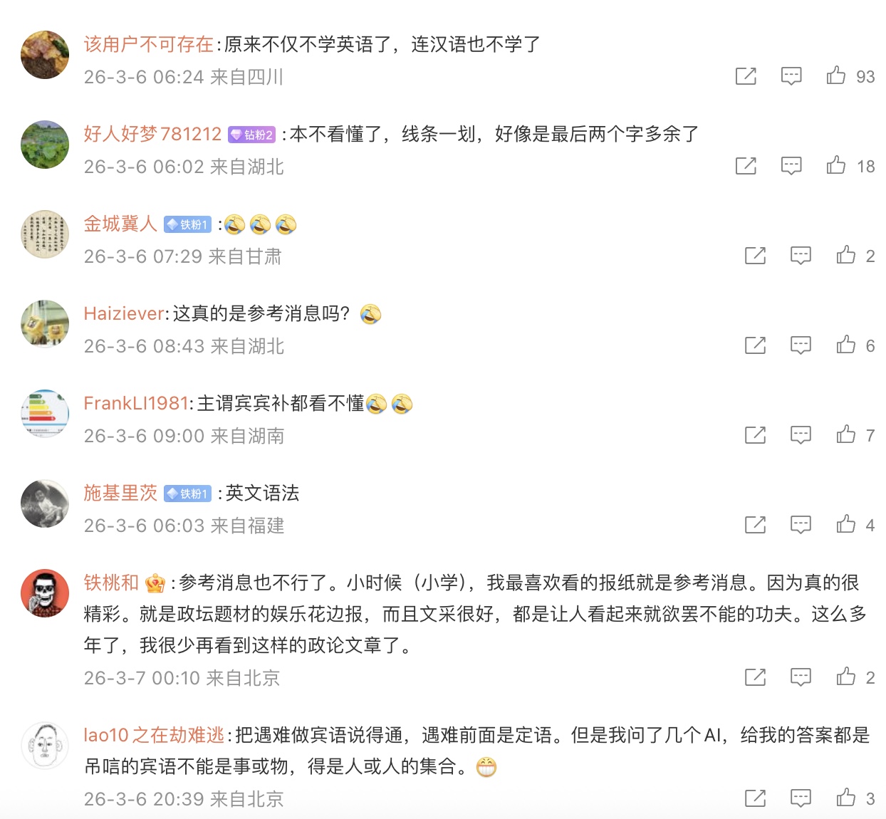 網友批評,「原來不僅不學英語了,連漢語也不學了」「我問了幾個AI,給我的答案都是弔唁的賓語不能是事或物,得是人或人的集合」「編輯應該文字功底也是過人的,怎麼現在都這麼拉垮了」「就句論句,賓語可以是主謂結構的短語,但『弔唁』這個謂語所帶的賓語一般是名詞,所以,此句不通」「草台班子」「我真的服了,某社能犯這麼腦殘的語文問題?」