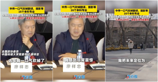 據中共央視3月8日報導,全國政協委員、中國傳媒大學黨委書記廖祥忠聲稱,「去年我一口氣砍掉了16個本科專業方向」、「我把未來定位為」、「我現在正在做課堂革命」、「我說怎麼講好一堂課」。