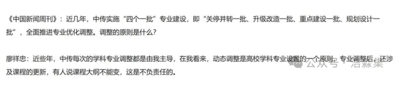 這不是廖祥忠第一次用這種口氣說話,廖祥忠於2024年9月份接受《中國新聞週刊》專訪《廖祥忠:中傳再迎「沖頂」戰》時稱,「中傳每次的學科專業調整都是由我主導」。
